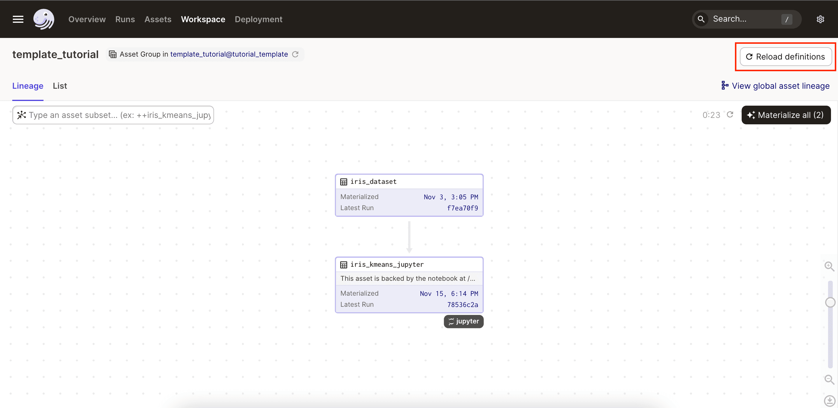 • As with the iris_kmeans_jupyter asset, we set the group_name parameter to organize our assets in the UI.